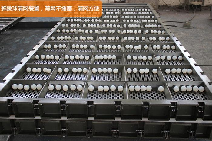2、裝有彈跳球清網(wǎng)裝置,此清網(wǎng)形式系統(tǒng)通過布設在篩網(wǎng)下、托球板上面的高性能彈跳球不規(guī)則的擊打篩網(wǎng),靠二次諧振完成清網(wǎng)防堵,其內部結構如圖4所示。此結構簡單易行、效果顯著,適用于大多數(shù)篩分作業(yè)的清網(wǎng)和防堵。